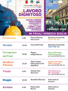 A Pordenone l’appuntamento è dalle 9.30 in Piazza Martiri del lavoro, con partenza del corteo alle 10, preceduta dall’omaggio al monumento dei caduti sul lavoro. Alle 11 l’arrivo in piazza Municipio e il comizio delle segreterie territoriali Cgil-Cisl-Uil.